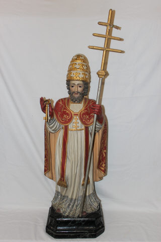 Figura masculina, em vulto pleno, de+ pé em posição frontal. Rosto longo, barbado, olhando para baixo. Na mão direita segura duas chaves, enquanto com a esquerda segura uma cruz de três braços. Calça luvas vermelhas. Representada com mitra papal, ornada por três anéis vegetalistas a dourado. Traja túnica branca, com orla inferior em leque, imitando renda, sobrepujada por estola e por capa vermelhas. Capa com capuz, presa na frente, junto ao peito, por firmal, do qual sai uma cruz de três braços, decorada a dourado no sebasto, por friso fitomórfico.