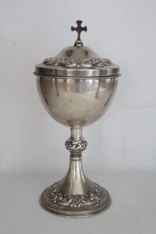 Píxide de base circular, alteada. Pé troncocónico de arranque guarnecido por friso de volutas vegetalistas e flores quadrifólias. Nó bojudo, decorado por festão. Apresenta copa lisa. Tampa campaniforme, com tarja ornamental semelhante à do pé. A peça é rematada por cruz pátea.