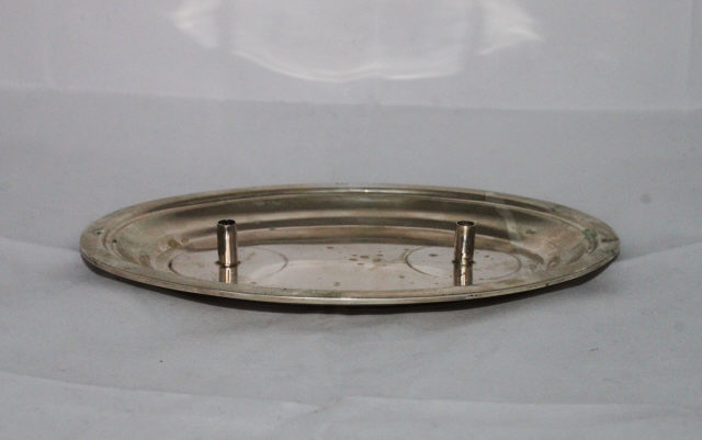 Prato oval, de fundo rebaixado. No fundo apresenta dois espigões cilíndricos, para encaixe das galhetas.