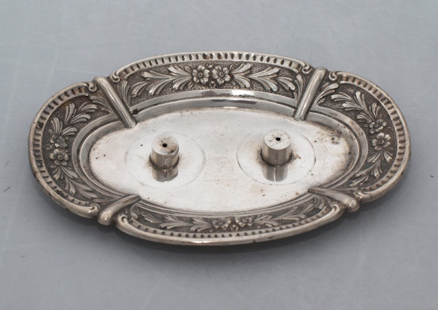 Prato oval, quadrilobado, de fundo rebaixado, com dois espigões cilíndricos para encaixe das galhetas. Bordo definido por quatro painéis, com festões relevados sobre fundo pontilhado, separados por gomos, e delimitados inferiormente por tarja lisa e superiormente por tarjas caneladas, em voluta.