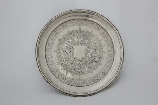 Salva circular, assente sobre três pés, formados por duas volutas. Orla lisa compósita, e fundo ligeiramente rebaixado. Este é guarnecido por friso em ziguezague, sucedido por largo festão, destacando ao centro um escudete liso encimado por um pássaro.